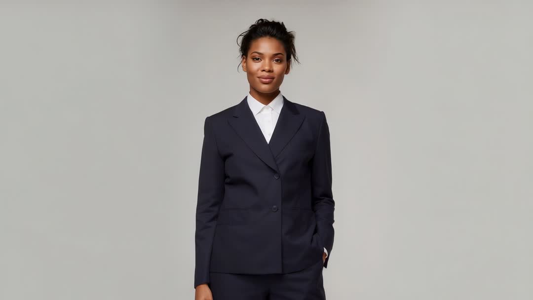 AI Generated Image. Featuring poised woman in navy suit smiling and adjusting pose with right hand in pocket, clip conveying confidence, approachability, professional polish. Neutral background keeping focus on subject for easy text overlays and branding. Ideal for corporate about pages, recruitment campaigns, LinkedIn profile banners, executive training modules, product ads for professional attire, fashion lookbook, editorial features, diversity and leadership stories. Offering flexible framing for widescreen, square, and vertical formats, compatible with lower thirds and title animations. Presenting neutral color palette and balanced contrast for seamless brand color grading. Licensing suitable for commercial and editorial use, ideal for marketing, HR, advertising, and content creation.