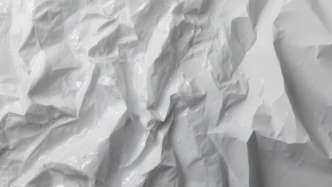 AI Generated Image. Video showing camera panning across crumpled glossy white film with scattered water droplets, revealing deep folds and sculptural ridges. Lighting catching reflective highlights and wet sheen, creating high-contrast abstract texture. Close-up framing emphasizing tactile surface and subtle shadow play. Working well for background loops, texture overlays, motion graphic transitions, product packaging mockups, website headers, social media reels. Pairing with bold typography or minimal color accents for modern branding, beauty advertising, or architectural concept visuals. Providing neutral monochrome palette for flexible color grading and compositing.