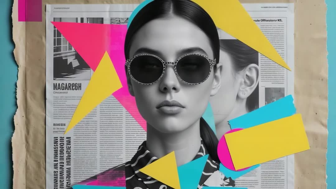 AI Generated Video. Image depicts model wearing sunglasses in front of an abstract background composed of newspaper motifs and striking geometric shapes colored in yellow, cyan, and magenta. This video merges fashion with contemporary art through bold and colorful design elements, ideal for use in fashion magazines, trend-setting blogs, or graphic design inspirations.