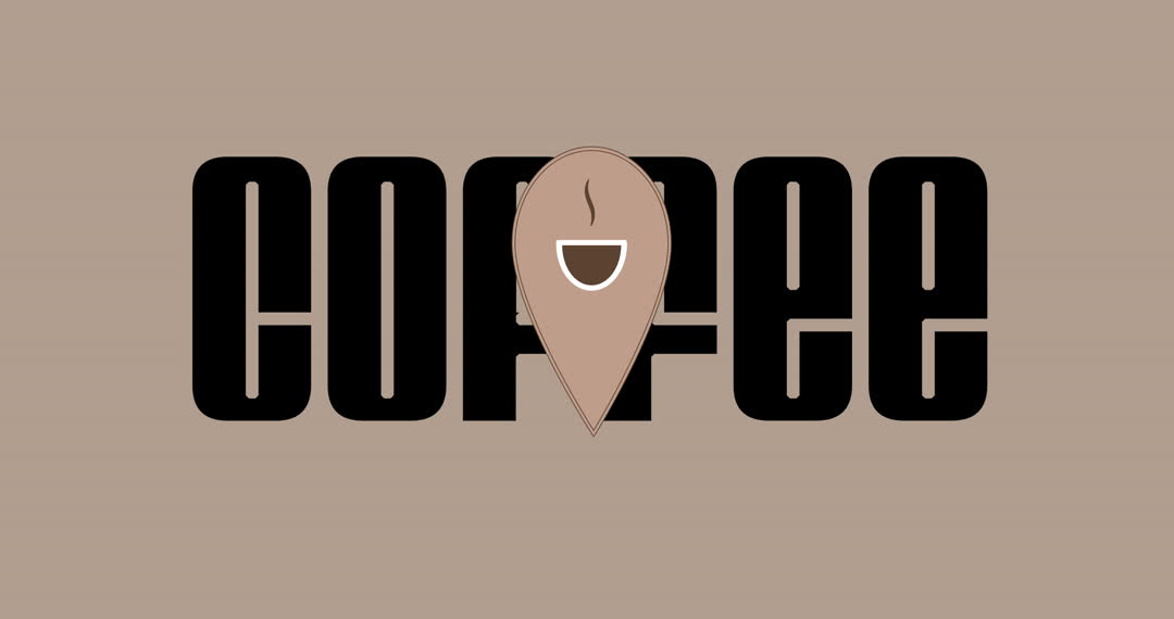 This graphic features a bold design with the word 'coffee' in large black letters against a beige background. The 'O' in 'coffee' is replaced with a pin icon showcasing a steaming cup, combining elements of direction and coffee culture. Ideal for use in marketing materials for coffee shops, banners, websites or as part of a product line launch for brewing goods to attract a young, modern audience.