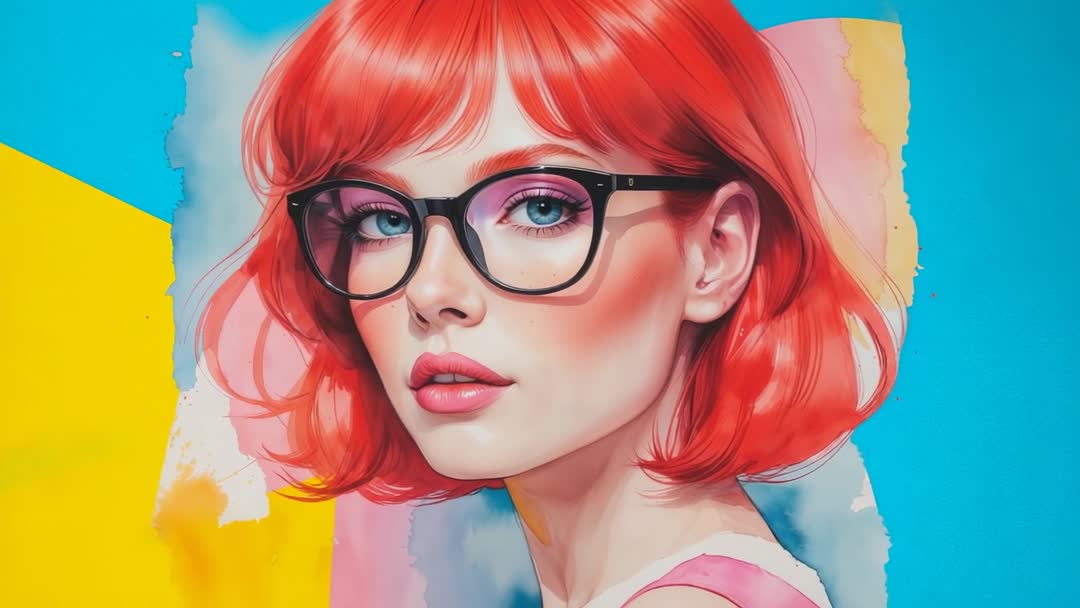 - Stylized Portrait of Woman with Red Hair and Glasses Against Colorful Backdrop