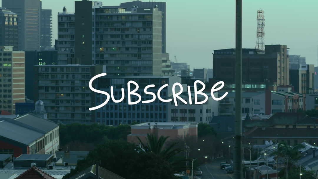Text overlay reading 'Subscribe' across a dynamic urban cityscape during twilight, showcasing modern skyscrapers and infrastructure. Ideal for digital marketing, emphasizing content subscriptions and online engagement for brands looking to boost presence using captivating urban visuals integrated with direct call-to-action elements.