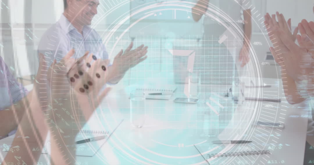 Caucasian businesspeople are seated around a table in the office, enthusiastically applauding. A futuristic virtual display with a digital counter overlay suggests technological innovation and progress. This scene typically illustrates success in business endeavors, corporate cooperation, and embracing technology. Useful for content related to corporate achievements, teamwork highlights, or advanced business solutions.