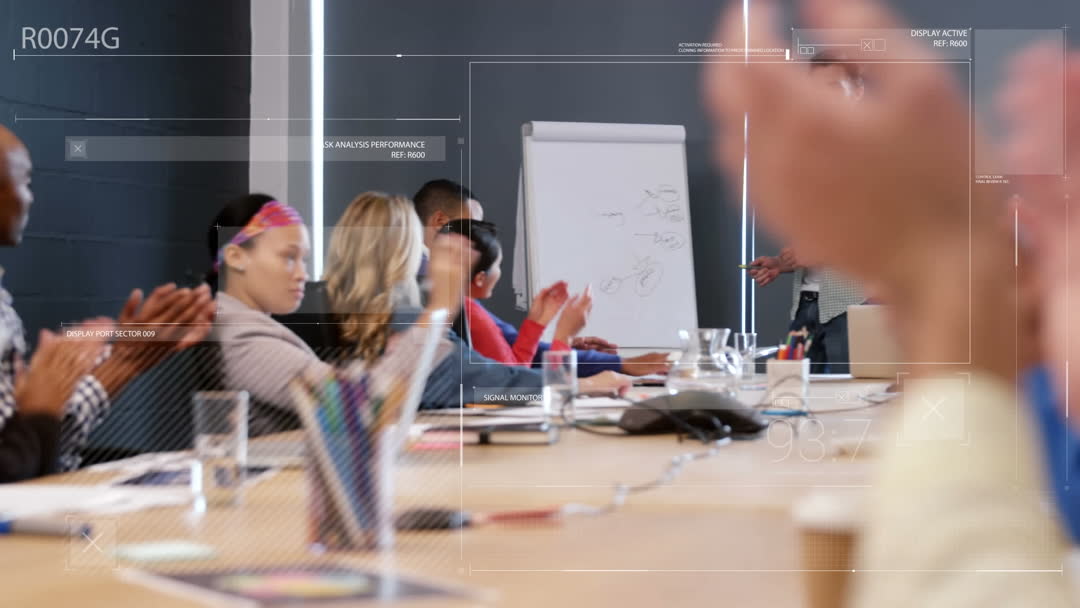 Business professionals gathered in conference room applauding post-presentation. Ideal for use in corporate training materials, articles about effective presentations, teamwork, and innovative office environments. Incorporates futuristic app function elements for technology-focused themes.