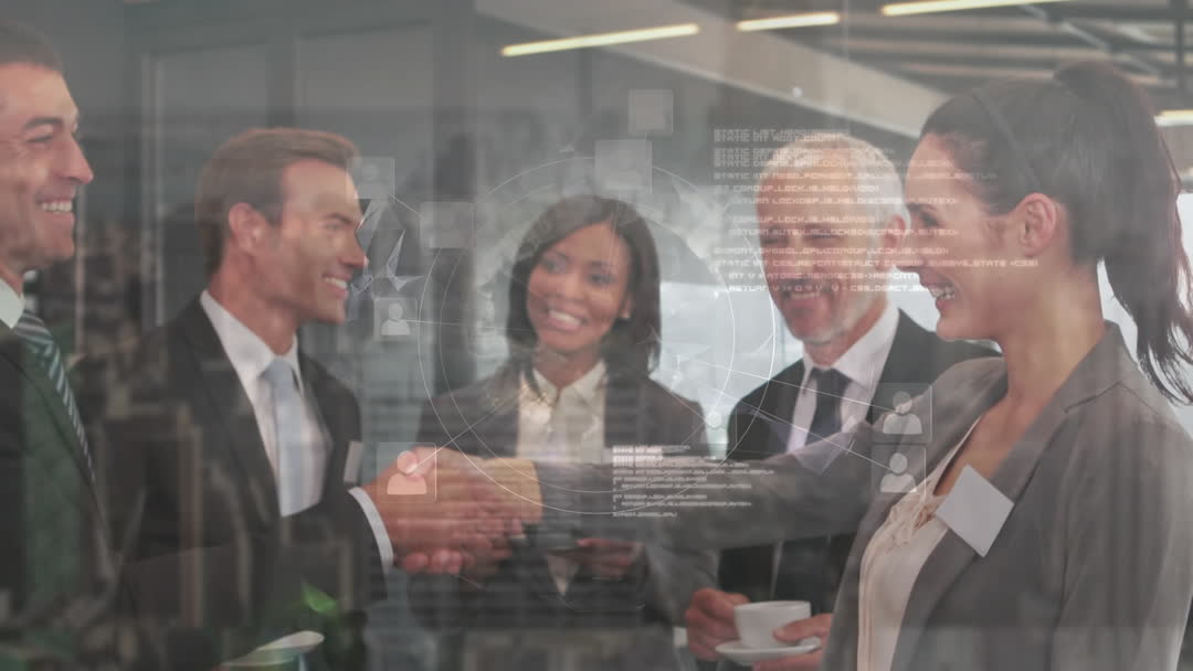 Group of diverse business professionals meeting informally, engaging in discussion and shaking hands over coffee cups. Perfect for conveying a sense of successful collaboration, teamwork spirit, and professional networking in marketing materials, online articles, presentations on effective team dynamics or contemporary office environments.
