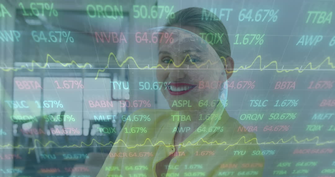 Businesswoman smile highlighted by overlay of stock market data and financial graphs. Indicates economic growth, investments concept, perfect for use in finance-related content including blog articles about stock market predictions or corporate investment marketing materials.