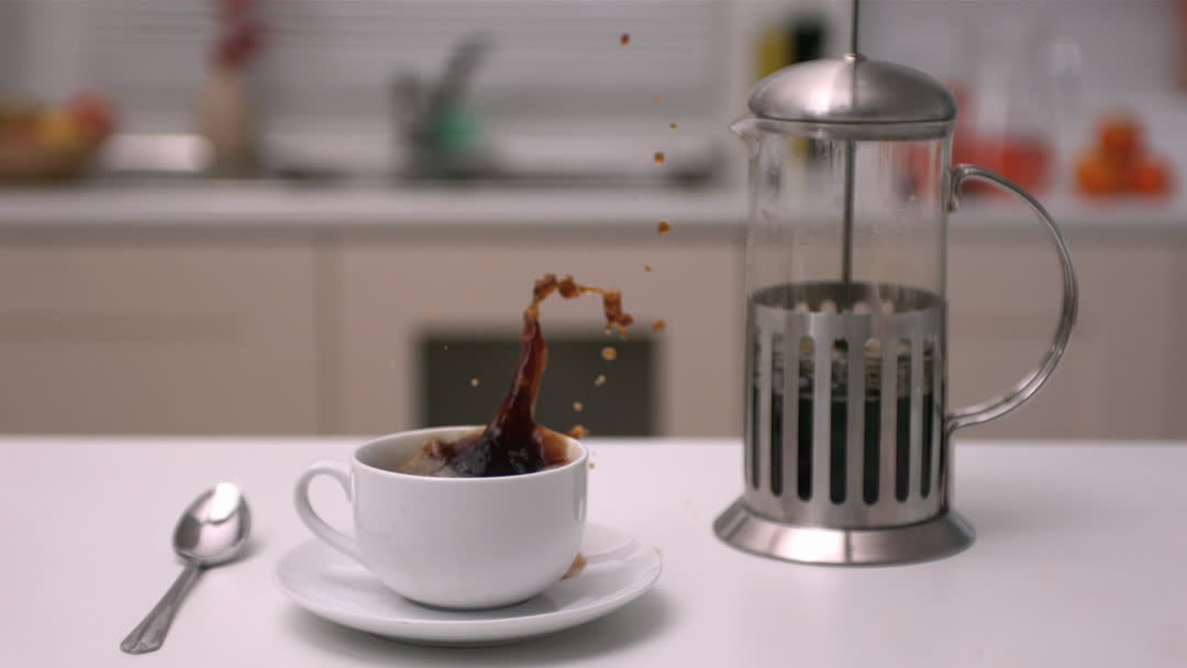 Coffee cup in a kitchen with a sugar cube causing a splash when added. Traits like French press reflect a fresh coffee preparation typical to morning routines or coffee-making content. Can be used by food bloggers and websites about beverages or breakfast tips.