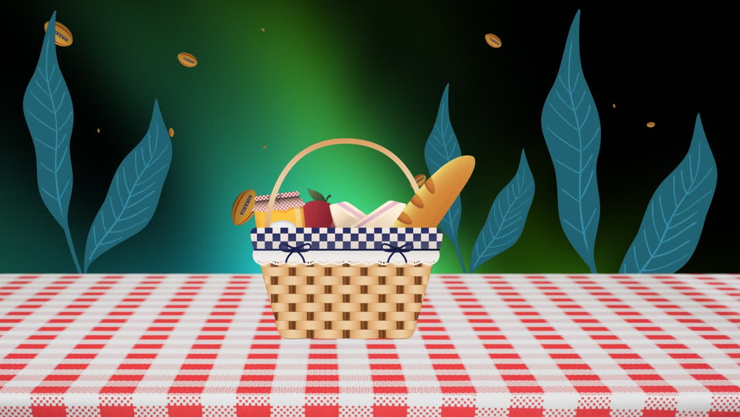 Wicker basket filled with picnic essentials including apples and baguette. Set on red and white checkered tablecloth, evokes feelings of a relaxing summer outing. Leaves and coins animate around basket adding whimsical touch. Perfect for illustrations related to recreational activities, outdoor dining, summer events, and picnics.