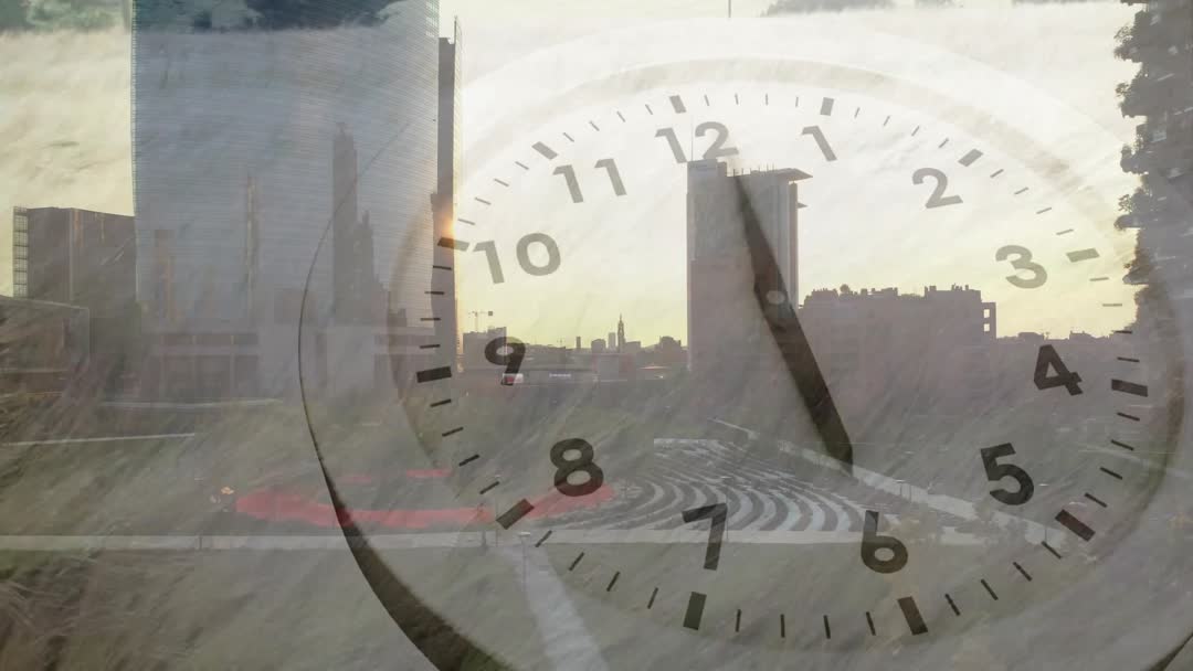 - Sun Moving Behind Tower, Analog Clock Hands Rotating Over Urban Skyline