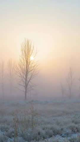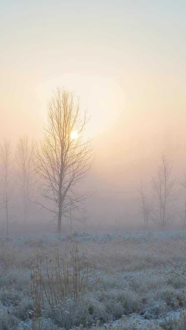 AI Generated Video. Vertical footage showing sun peeking through dense morning fog around tall bare tree in frosty meadow. Soft pastel light spreading across misty horizon while frost coating grasses and reeds in foreground. Distant tree silhouettes fading into haze, creating cinematic sense of solitude and calm. Slow pans and subtle zooms working well with ambient wind or soft piano audio for meditative and wellness content. Vertical framing optimizing use for social media reels, stories, mobile wallpapers, and short form ads. Suitable for seasonal campaigns, nature documentary openers, background loops for relaxation apps, and mood-setting b-roll in travel or environmental projects. Color grading suggestions include warm pastel highlights and cool blue shadows to emphasize contrast between sun glow and frosty ground. Export recommendations: 9:16 vertical format, 4K or 1080p H.264 or HEVC for social platforms. Looping versions useful for ambient displays and waiting room screens.