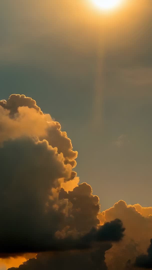 - Sun rising above cumulus clouds casting golden glow in vertical timelapse