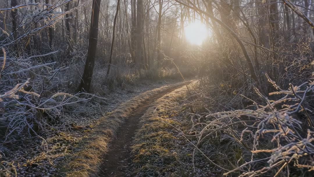 AI Generated Video. Video showing sun rising and backlighting winding frost-covered forest trail, hoarfrost sparkling on branches and ruts tracing path through frozen grass. Camera tracking curve toward bright sun, creating strong backlight, long shadows, and golden rim light against cool blue tones. Footage conveying quiet morning, cold crisp air, and solitary nature walk. Ideal for nature documentaries, travel promos, seasonal winter campaigns, meditation or wellness backgrounds, website hero banners, social media reels, and outdoor gear advertising. Editing suggestions: apply slow push-in, gentle color grading to enhance golden highlights, add ambient wind or soft piano for mood. Available in wide frame suitable for cinematic use and looping.