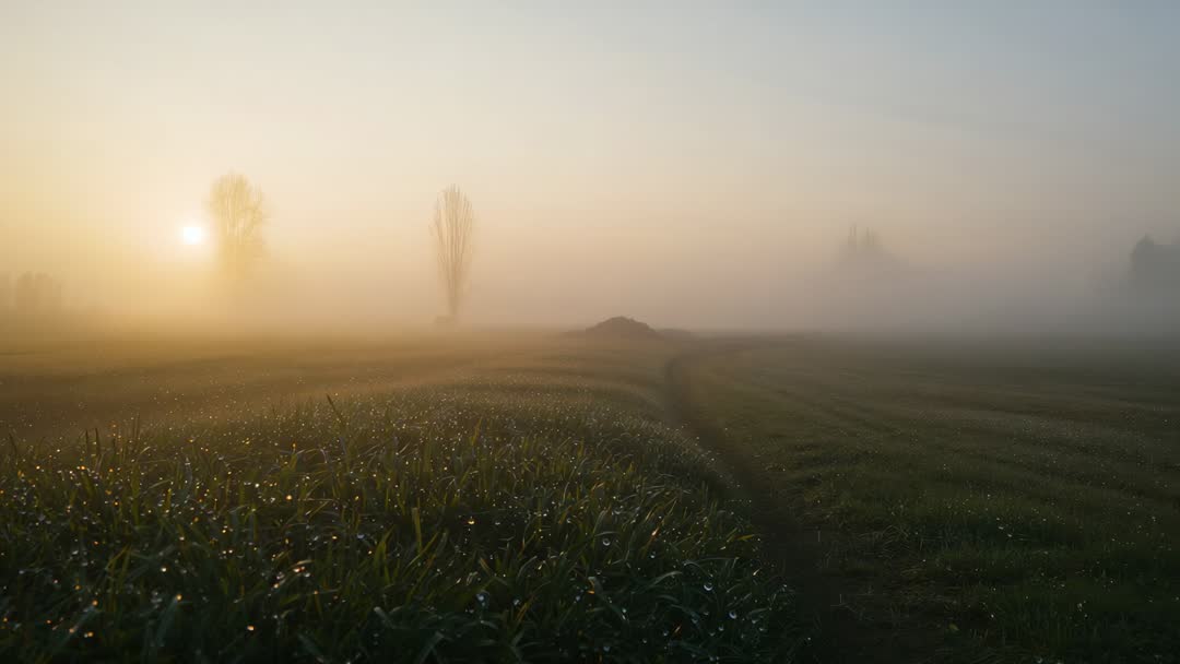 AI Generated Image. Video showing sun rising over dew-covered field while fog lifts, filling scene with soft golden light. Foreground showing grass blades covered in dew drops, creating sparkling bokeh highlights. Central furrow and faint track guiding eye toward distant silhouetted trees and low horizon. Atmosphere conveying calm, solitude, early morning freshness. Ideal for use as background footage for websites, hero banners, social ads, travel and tourism promos, farming and agriculture campaigns, weather segments, wellness and meditation apps, calming video loops. Suitable for cinematic openers, nature documentaries, seasonal calendars, desktop wallpaper clips and broadcast lower-thirds. Color grading suggestions include preserving warm tones, boosting contrast slightly and retaining misty detail. Clip trimming and crossfade looping creating smooth repeat for ambient backgrounds and mindfulness content.