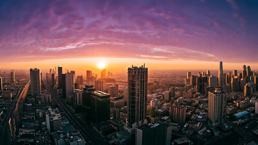AI Generated Image. Video clip showing sun rising behind cluster of modern skyscrapers, central tower bathing in warm golden light, long avenue stretching toward horizon. Purple and orange rippled clouds forming dramatic sky over expansive urban grid, foreground blocks falling into shadow while skyline glowing. Wide aerial perspective emphasizing scale of metropolis and leading lines created by roads and rooftops. Cinematic color grading and soft haze creating moody dawn atmosphere. Perfect for corporate intros, real estate promos, travel commercials, city branding, architectural presentations, urban planning videos, broadcast openers, livestream backgrounds. Ideal for hero banners, website headers, social media reels, slideshow backdrops, corporate event visuals. Suggested edits include slowing clip to 10-20 seconds, adding ambient music or soft synth pad, applying subtle parallax or slow zoom for depth, looping seamless segment for continuous background, overlaying text or logo on darker foreground areas.