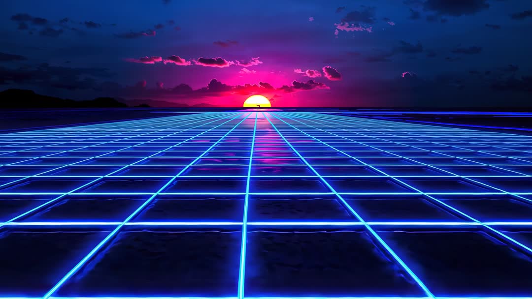 AI Generated Image. Video showing sun rising over neon grid while magenta sky reflecting on glossy surface. Scene featuring endless glowing mesh leading toward horizon, creating strong sense of depth and perspective. Color palette blending electric blue and hot magenta for high-contrast retro aesthetic. Working well for music video backgrounds, album covers, website hero banners, event posters, VJ loops, cinematic openers, social media promos, and tech product launches. Working well for looping as ambient background or extending into animated sequence for motion graphics. Delivering intense neon mood for branding, advertising, editorial features, and concept art. Offering editable color and grid scale for fast customization and seamless integration into multimedia projects.