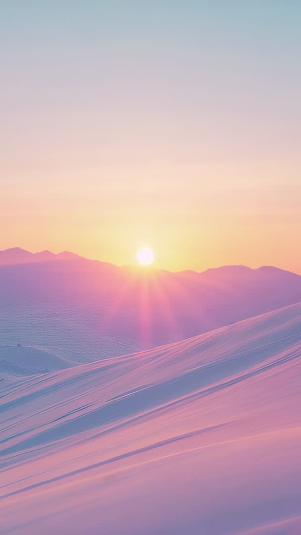 AI Generated Image. Clip showing sun disk rising above mountain ridge, bathing snowfields in pastel pink and golden light. Vertical framing emphasizing sky height and foreground contours, with soft lens flare and long shadows creating peaceful cinematic mood. Color palette featuring peach, lavender, pale blue for modern calming aesthetics. Suiting mobile backgrounds, Instagram Stories, TikTok vertical ads, and app intros. Serving wellness and meditation content, travel promos, seasonal greetings, environmental campaigns, and editorial segments about nature or climate. Looping smoothly for ambient background use and title sequences. Providing high-resolution vertical composition optimized for smartphone screens and social media formats.