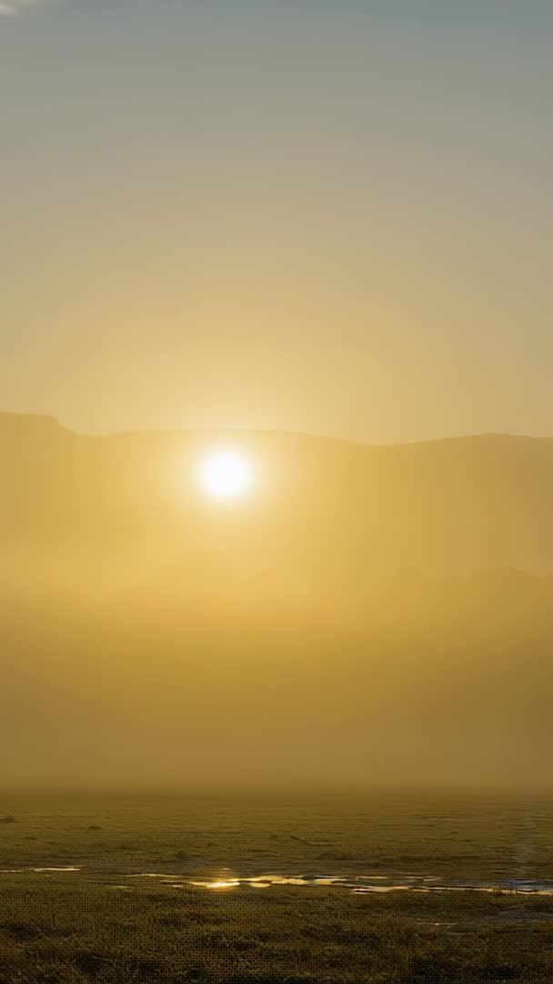 AI Generated Video. Sun rising above distant ridge, mist thinning across marshland with puddles reflecting warm golden light. Vertical footage emphasizing layered atmospheric depth, soft color gradient, and minimalist composition. Slow tranquil motion working well for calming intros, meditation loops, travel promos, nature documentaries, and mobile social reels. Ideal for hero backgrounds on landing pages, ambient B-roll in video projects, inspirational quote overlays, wellness app loops, or promotional ads targeting morning routines. Shot in vertical 9:16 orientation and high resolution, ready for mobile-first distribution and gentle color grading.