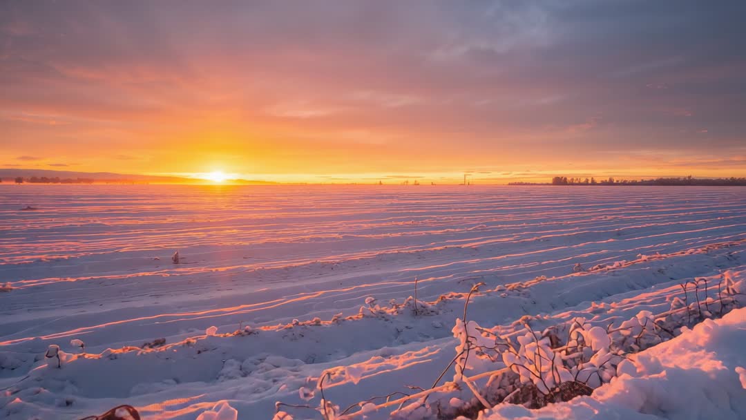 AI Generated Video. Clip showing sun rising over snow-covered plowed field, casting warm pink and orange light across parallel furrows and fence line. Wide-angle composition emphasizing leading lines toward horizon and dramatic cloud layer. Low winter sun creating long shadows and subtle texture on snow surface. Footage serving as background loop, website hero header, broadcast opener, documentary b-roll, seasonal marketing, agricultural story, travel promotion, or social media reel. Serving well for landscape and nature segments, climate visuals, farm life features, greeting card or calendar designs. Suggesting gentle color grading to enhance warm highlights, applying slow cross-dissolve for seamless loop, and adding soft ambient music or voiceover for emotional impact. Offering high-resolution delivery suitable for cinematic and commercial projects, editorial use, and large-format prints or motion backdrops.