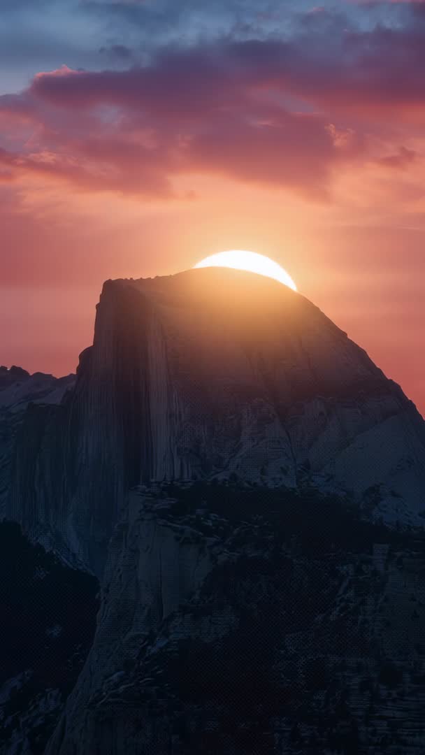 AI Generated Video. Vertical dawn video showing sun rising behind granite dome and creating dramatic rim light along steep rockface. Warm golden hues coloring cloud deck while high valley remaining in deep silhouette. Working well for social media reels, travel promos, adventure film openers, outdoor gear advertising, landscape documentary sequences. Clip working well for hero background, title cards, phone wallpaper, inspirational quotes, calming meditation visuals. Footage lending itself to slow motion, time-lapse, cinematic color grading workflows and fade transitions. Suggested edits include overlaying bold typography, adding ambient music, combining with drone footage for establishing shot, and using speed ramps for dramatic reveal.