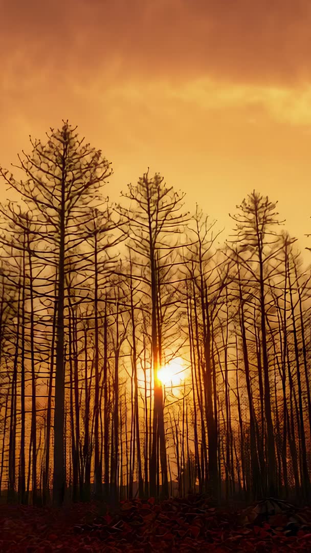 AI Generated Video. Vertical video showing sun shifting behind slender leafless trunks, casting warm orange haze across woodland. Tall bare trees standing as dark silhouettes against glowing sky, sunburst peeking through trunks and creating vertical lines that draw eye upward. Scene conveying quiet solitude, post-fire recovery mood, or autumn dusk ambience. Use for cinematic intros, documentary sequences about wildfire recovery, seasonal transition features, nature and landscape reels, mindfulness or meditation clips, background for atmospheric ads, social media reels and vertical video platforms, and mobile lock screens. Recommend using warm color grade to enhance amber tones, slow crossfade transitions for dramatic pacing, and placing titles in upper third where sky remains uncluttered or logos in lower dark area for strong contrast. Clip working well with ambient music, minimal narration, or subtle soundscape to preserve moody atmosphere.