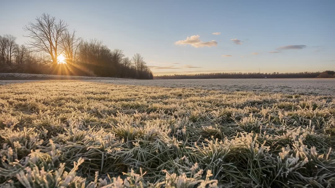 AI Generated Video. Video showing sun rising through bare trees while frost-covered grass glittering across meadow at dawn. Low-angle perspective highlighting frost crystals on blades and long shadows stretching across field, warm golden light contrasting cold tones. Working well for environmental stories, seasonal stock, weather forecasts, travel promotions, wellness content, winter agriculture features, background footage for websites, nature documentaries, social media reels. Working as opener for morning sequence, overlaying text for inspirational quotes, looping for calming backgrounds, incorporating into calendar or greeting card design. Color grading suggestion: boosting warm tones and contrast to enhance sunburst and texture. Shot details: wide-angle composition with low camera height, foreground texture in sharp focus and distant horizon providing depth. Frame delivering calm, crisp mood and strong visual contrast between cold frost and warm sunlight.