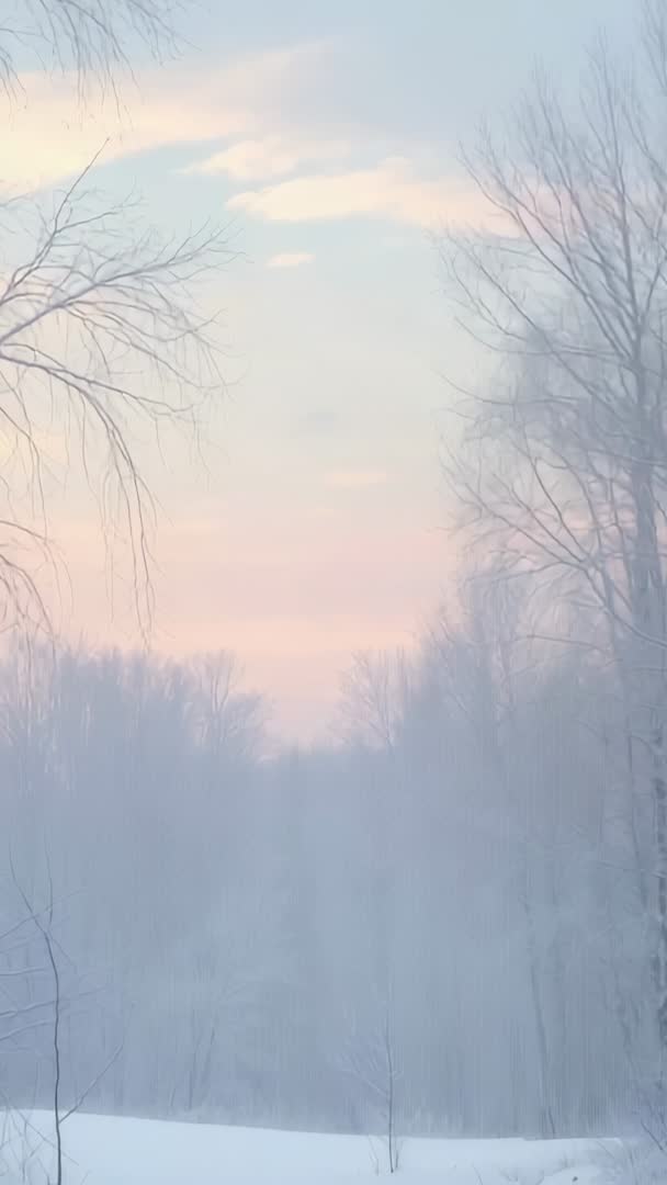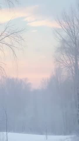 AI Generated Video. Vertical video showing sun rising, tinting pastel sky with pink and blue hues over snowy forest clearing while mist thinning among bare trees at dawn. Soft, low-contrast light and muted color palette creating tranquil, ethereal mood for calming visual storytelling. Ideal for background footage in wellness and meditation videos, vertical social media ads, travel and nature promos, seasonal greeting reels, website hero header, cinematic b-roll, and documentary sequences. Works well with slow pan or subtle zoom, overlaying minimal text or logo in upper third, and pairing with ambient music or voiceover to enhance reflective, peaceful atmosphere.