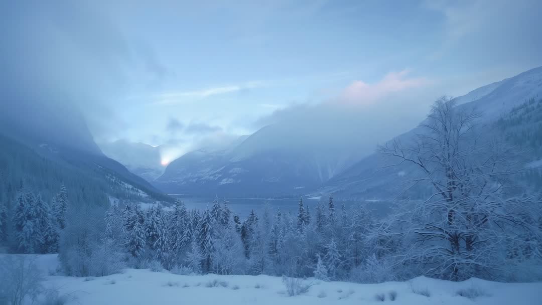 AI Generated Video. Video showing sunbeam piercing snowy alpine valley at dawn, mist rolling across mountain ridges, frosted conifers and bare birch framing foreground, and pale sunrise glow breaking through low clouds. Cinematic blue hour palette creating calm, cold atmosphere with soft backlight on snow and distant reflections on lake surface. Working well with slow pan or subtle dolly-in, running 8-20 seconds for web hero loops or longer cuts for documentary use. Post-production tips: enhancing cool blues, lifting shadows slightly, preserving soft highlights for dramatic contrast. Usage ideas: travel and tourism promos, nature documentaries, seasonal social media headers, meditation and wellness apps, holiday greeting visuals, website hero banners, background for inspirational quotes or environmental messaging.