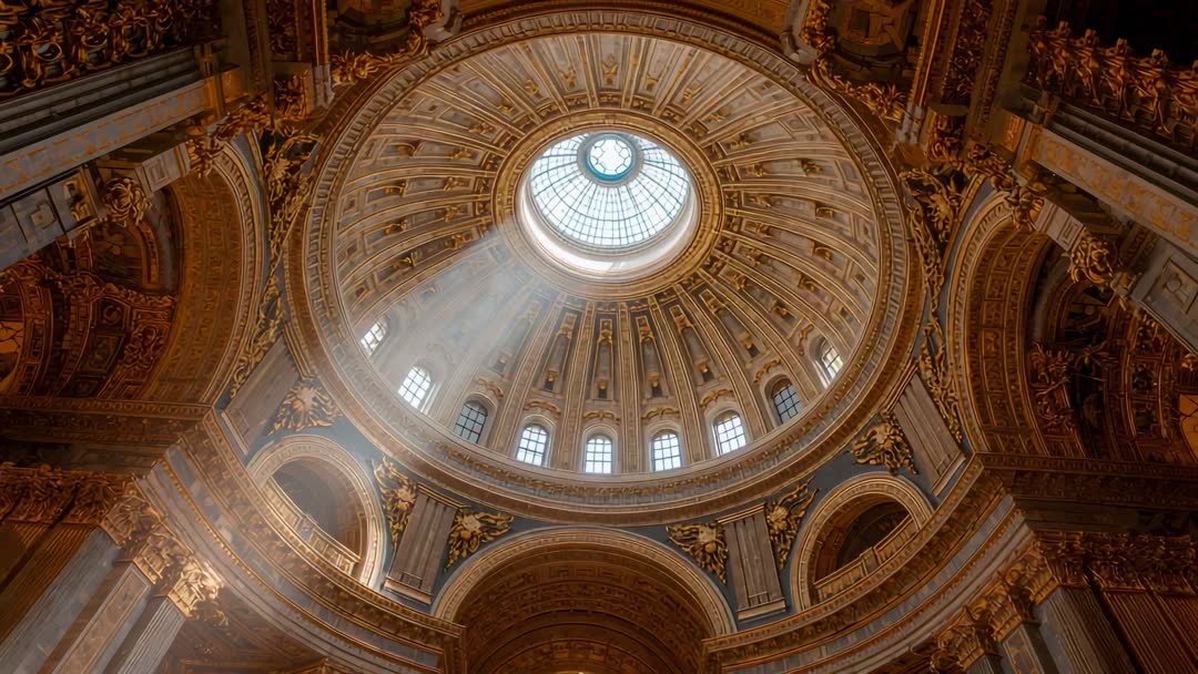 AI Generated Video. Sunlight streaming through the oculus highlights ornate architectural details of a cathedral dome, revealing gold leaf adornments and frescoed panels. The play of light adds a majestic aura to the historic and sacred environment, making it ideal for visuals depicting heritage sites, artistic expressions, and cultural themes.
