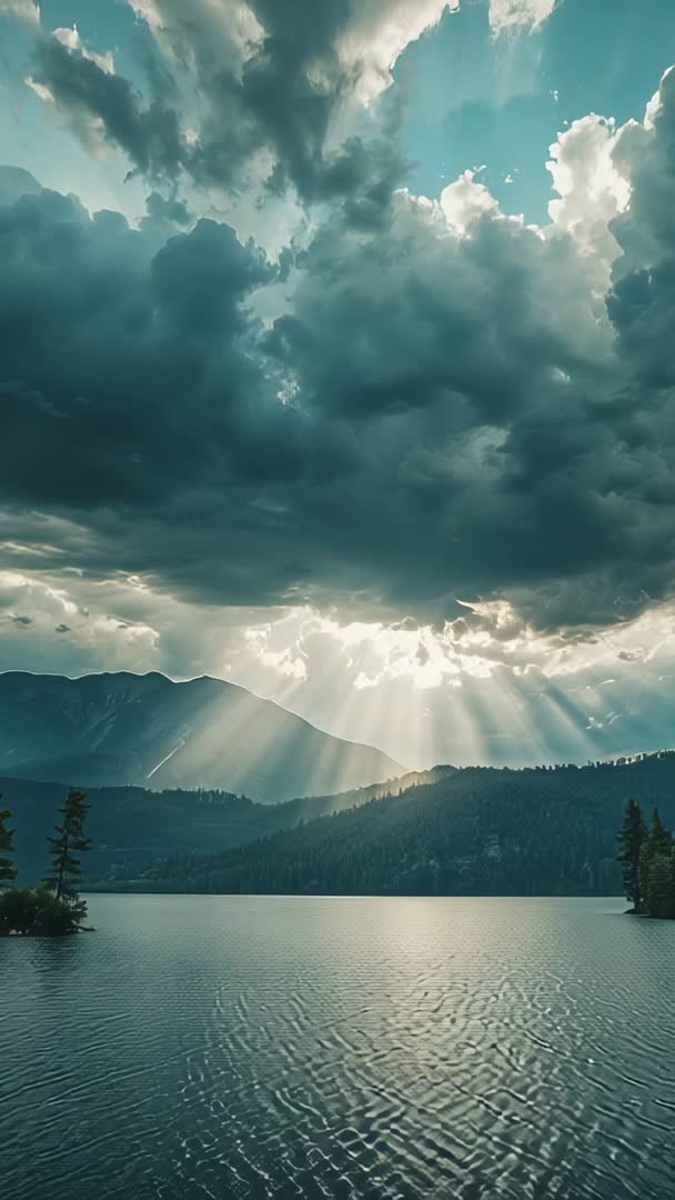 AI Generated Image. Showing dramatic crepuscular rays piercing storm clouds above mountain lake, with sunlight reflecting on rippled water and silhouetted conifer-covered ridges. Featuring small forested islets and textured shoreline creating depth for cinematic compositions. Capturing moody atmosphere suitable for nature documentaries, travel promos, weather segments, mindfulness and meditation content, brand storytelling and background loops for events. Working especially well as vertical video for social reels, smartphone wallpapers, app backgrounds and hero clips on websites. Providing color palette and lighting for calming or dramatic visual narratives; editing-friendly footage for color grading, slow-motion intros and cinematic transitions.