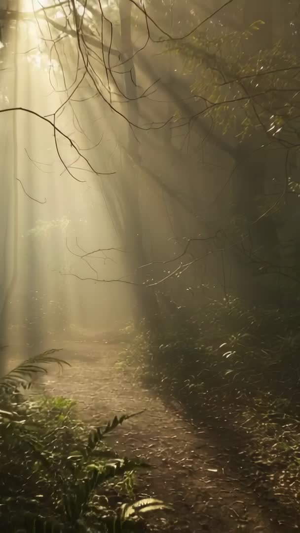 - Sunbeams Streaming Through Mist Along Woodland Path with Ferns — Vertical Morning Forest