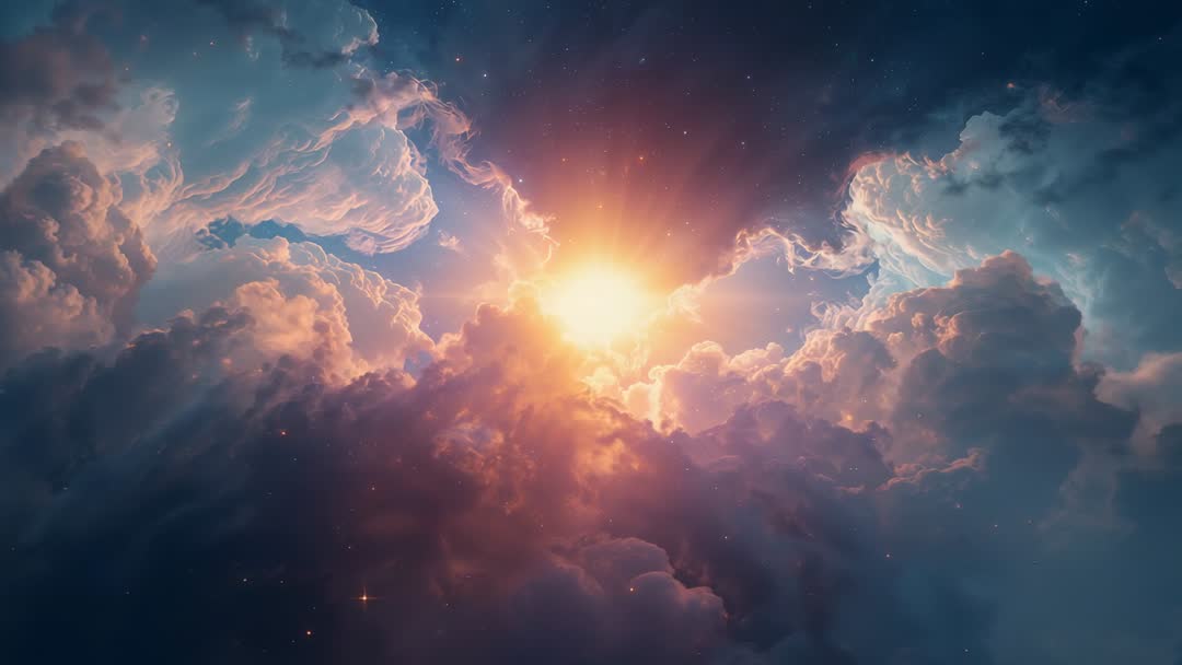 AI Generated Image. Showing cinematic sunburst breaking through dense cumulus cloudscape at dawn, featuring warm golden rays, luminous halo, and subtle sparkles. Conveying sense of awe, hope, renewal, and cosmic wonder. Serving cinematic openers, meditation and wellness app backgrounds, website hero banners, social media headers, inspirational quote overlays, album covers, book trailers, science fiction visuals, and advertising for travel or outdoor brands. Working well as loopable sky footage for motion backgrounds, title sequences, event visuals, presentation backdrops, and live projection mapping. Allowing easy color grading to warm or cool palettes and providing space for overlaying text or logo. Including ai generated tag for stock categorization and creative briefs.