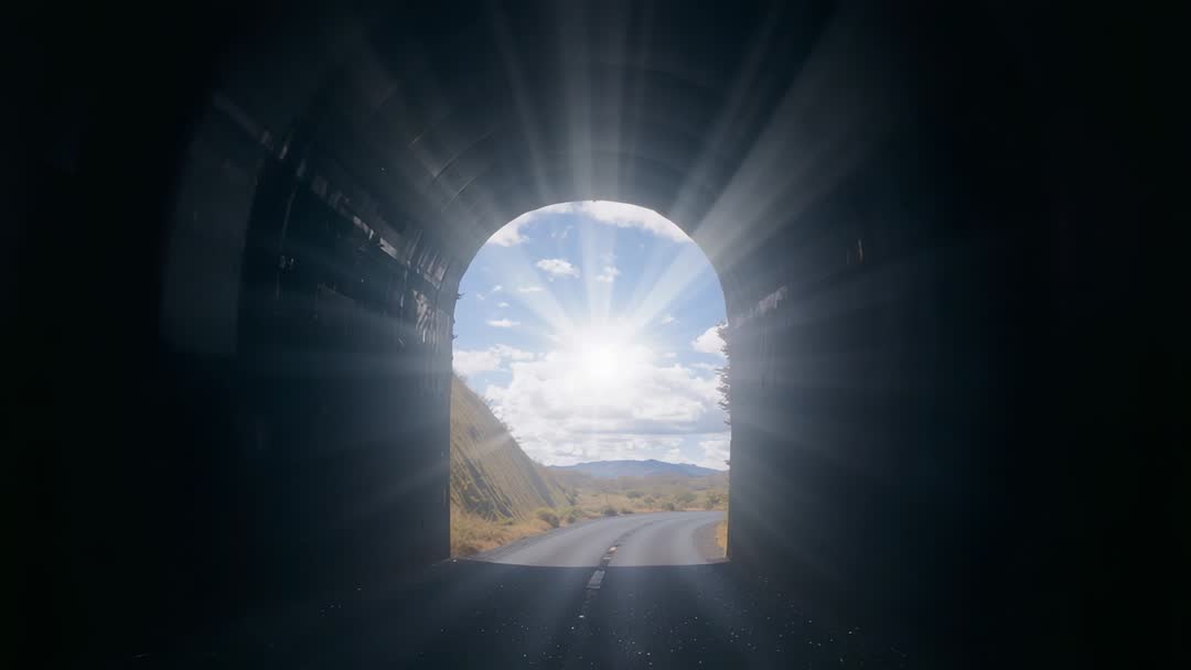 AI Generated Image. Scene showing sunburst through tunnel archway, road curving toward distant hills, bright rays flooding dark tunnel interior and creating striking contrast. Frame capturing strong lens flare, mid-day sky with scattered clouds, and dry scrub on slopes beyond tunnel. Visual mood conveying emergence, hope, journey, and dramatic transition from shadow to light. Ideal for travel promos, inspirational openers, safe-driving campaigns, adventure and road-trip sequences, or cinematic title backgrounds. Editing suggestions: using warm color grading to enhance highlights, adding subtle lens flare or light bloom for emphasis, applying slow crossfade for seamless transition, overlaying motivational headline or logo for marketing and social media content.
