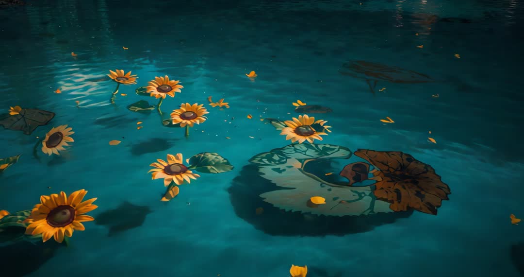 - Sunflowers Drifting on Tranquil Teal Pond with Floating Petals