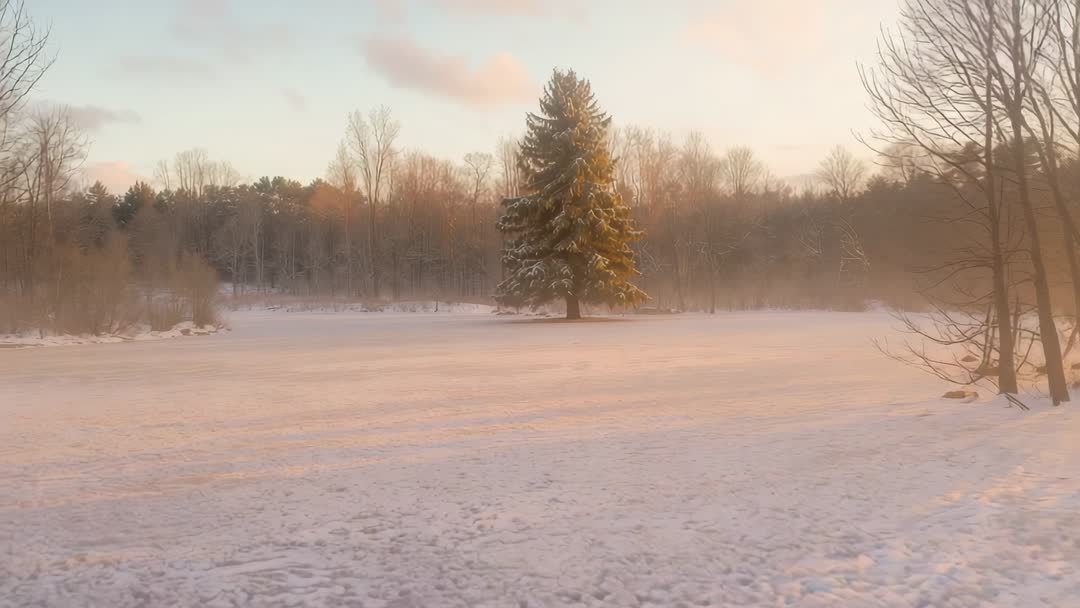 AI Generated Video. Showing lone evergreen catching warm golden-hour light while casting long shadows across snow-covered meadow. Featuring pastel pink clouds, soft mist along distant treeline, wide open foreground with textured snow and subtle sunrise tones. Offering calm, minimalist composition for seasonal storytelling, branding campaigns, social media banners, website hero backgrounds, meditation or wellness videos, and holiday marketing. Working well as slow panning B-roll, looping background, establishing shot for travel or nature documentaries, and ambient filler for broadcast or streaming. Pairing with gentle ambient music, soft voiceover, or inspirational copy for emotional impact. Providing versatile widescreen footage suitable for commercial projects, presentation backgrounds, digital ads, and desktop or mobile wallpapers.