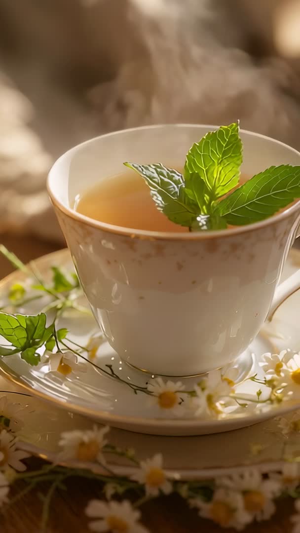 AI Generated Image. Vertical clip showing porcelain teacup containing steaming herbal tea, fresh mint sprig floating on surface and chamomile flowers scattering across saucer. Warm sunlight bathing scene, creating soft bokeh and golden highlights around rim and rising steam. Shot composing vertical frame for mobile-first platforms, allowing seamless use in Instagram Reels, TikTok, Pinterest Idea Pins and mobile ads. Usage ideas include opening sequence for wellness brand videos, background for recipe or tea-making tutorials, hero clip for spa or cafe promotions, and visual loop for packaging or product pages. Editing tips recommend centering teacup for portrait crop, slowing motion to emphasize steam, boosting warm tones and adding gentle ambient sound for ASMR-style content. Mood conveying calm, comfort and natural wellness, working well for seasonal campaigns, morning routine features and lifestyle storytelling.