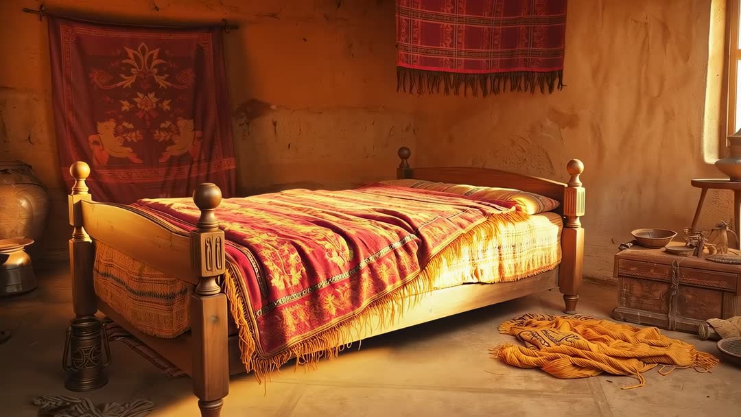 AI Generated Image. Clip showing sunlit rustic cabin bedroom at dawn, featuring wooden four-post bed draped with red woven blanket and fringed throw. Morning light pouring through right window, casting warm glow and soft shadows across textured plaster walls and wooden floor. Scene including hanging tapestry, ceramic bowls, carved chest, folded yellow throw on floor, and woven textiles adding handcrafted, lived-in character. Cinematic golden-hour lighting highlighting fabric textures, wood grain, and dust motes drifting in beam. Useful for travel and hospitality reels, interior design showcases, home decor blogs, lifestyle and slow-living content, meditation and wellness backgrounds, social media storytelling, and book cover or editorial use. Clip allowing for close-up shots of textiles, wide establishing shots, and ambient B-roll for warm, nostalgic narratives.