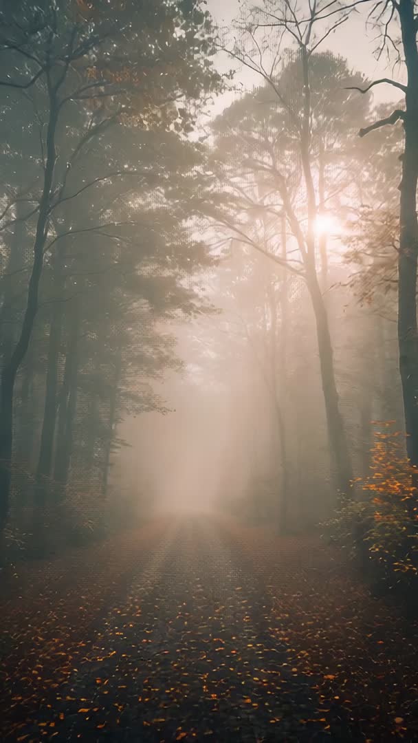 AI Generated Image. Vertical footage showing sunlight breaking through mist along narrow forest path during autumn morning. Sun rays filtering through tall trees, creating warm golden glow and long atmospheric beams over leaf-strewn trail. Composition offering strong vertical lines and deep layered depth, evoking mood of calm, mystery, and renewal. Use for Instagram Reels, TikTok shorts, mobile ads, website hero banners, documentary B-roll, cinematic openers, meditation and wellness promos, or seasonal marketing campaigns. Post-production tips: enhance warm tones and contrast to emphasize shafts of light, add gentle camera pan or slow zoom for immersive motion, and overlay subtle ambient sound for full sensory impact.