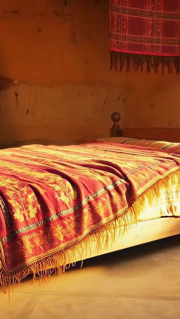AI Generated Video. Vertical video showing slow pan across sunlit wooden bed topped with red-gold woven blanket. Warm sunlight casting long shadows on earthen wall and textured textile, evoking cozy rustic atmosphere. Close framing and vertical composition suiting mobile-first platforms and social media reels. Ideal for travel and lifestyle reels, interior design showcases, hospitality marketing, cultural heritage features. Working well as B-roll for documentaries, background for title cards, product highlight for bedding or artisanal textiles. Color palette emphasizing warm golds and deep reds, enabling easy color grading and mood-driven storytelling. Length and motion giving gentle cinematic feel, matching slow-paced editorial and promotional content.