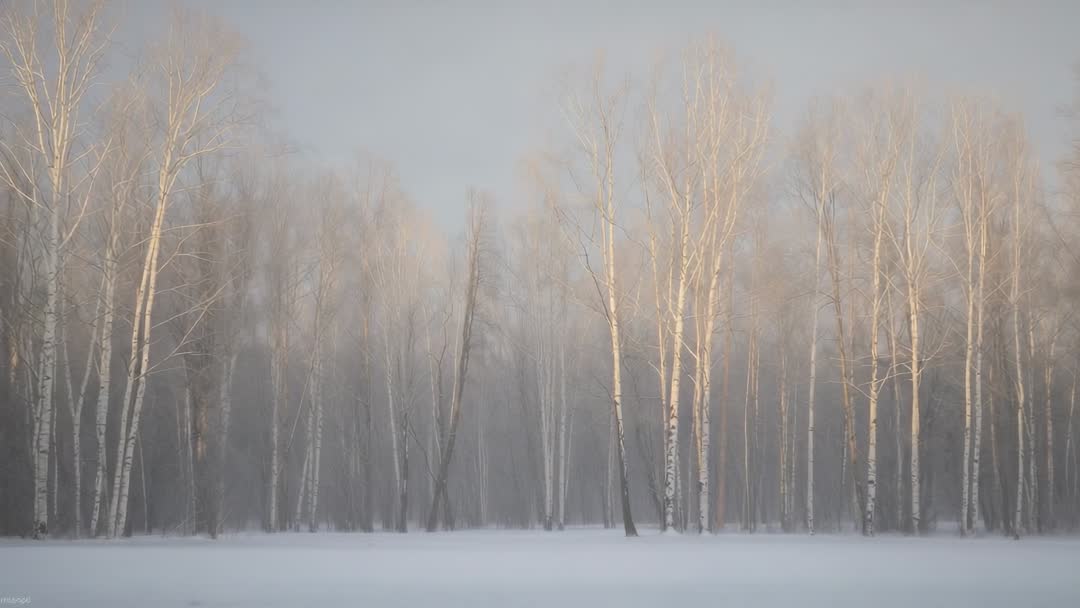 AI Generated Video. Video showing sunlight brightening white birch trunks in misty winter grove at dawn. Pale golden highlights softening birch bark while thin fog thinning across snow-covered clearing, creating layered depth and muted pastel palette. Scene evoking calm, solitude, slow seasonal transition and minimal composition. Working well for background footage for websites, hero banners, social media, seasonal advertising, wellness and meditation apps, nature documentaries and editorial projects. Providing ample negative space for text overlays and titles, with soft contrast and neutral palette supporting typographic treatment. Suitable for slow-motion edits and cinematic sequences, lending gentle motion and atmospheric depth. Including use in winter holiday campaigns, environmental storytelling, mindfulness content, calendar and greeting card design, and stock footage libraries.
