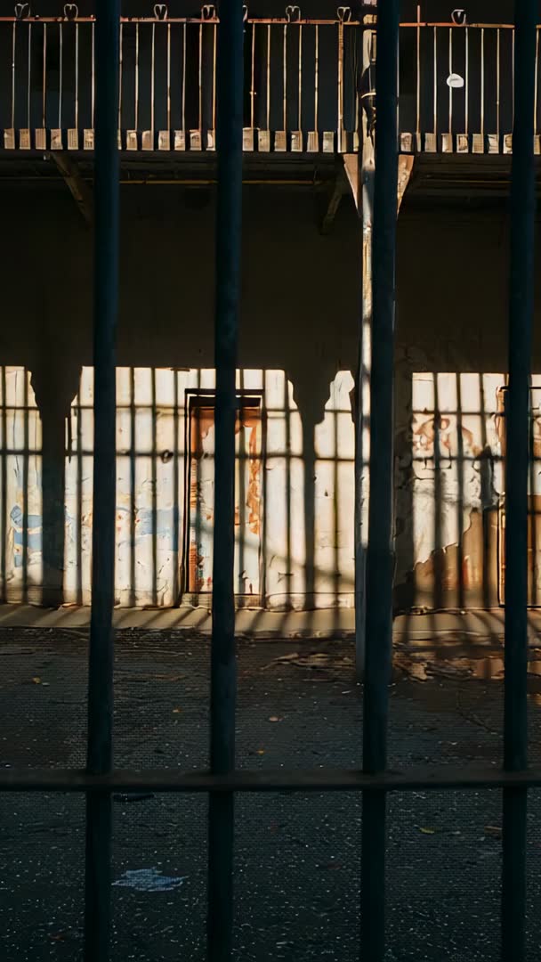 AI Generated Image. Vertical footage showing sunlight shifting through vertical metal bars and casting long striped shadows across abandoned industrial hall. Rusted metal gate and peeling paint on door creating tactile texture and vintage patina, while upper walkway railing adds layered geometry and depth. Contrast between warm low-angle light and dark foreground bars producing moody, cinematic atmosphere. Use as atmospheric B-roll for urban exploration videos, historical or crime documentaries, architecture reels, and cinematic title sequences. Work as background for social media vertical stories, promotional ads about restoration or redevelopment, texture overlay for film grading, and design element for websites or editorial spreads needing gritty, vintage urban mood. Footage suiting slow pans, pull-focus shots, and dramatic color grading to emphasize rust tones and shadow patterns.
