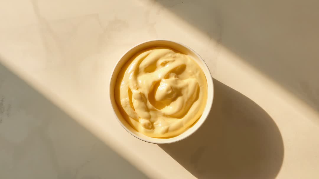 AI Generated Image. Overhead frame showing yellow mousse in white cup, sunlight casting diagonal shadow across pale marble surface, swirl texture and glossy finish creating appetizing focal point. Minimalist composition featuring strong negative space on left, providing clear room for text overlay or lower third graphics. Warm golden tones and soft high-contrast lighting creating cozy, summery mood suitable for food, lifestyle, hospitality projects. Ideal for recipe intros, social media reels, website hero headers, product packaging, culinary tutorials, and b-roll footage for commercials. Movement hint from blinds suggesting slow cinematic rhythm, helping create calm, intimate atmosphere. Recommended editing: subtle color grade to enhance yellow warmth, gentle vignette to emphasize cup, loopable 10-15s clip for background usage.