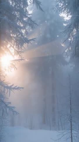 - Sunlight Filtering Through Frosted Boughs Casting Golden Beams in Snowy Fir Forest Vertical Video