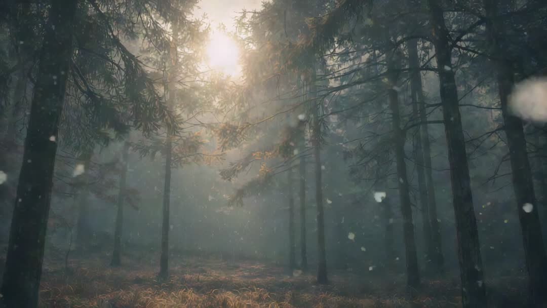 - Sunlight Filtering Through Misty Pine Forest at Sunrise with Floating Light Particles