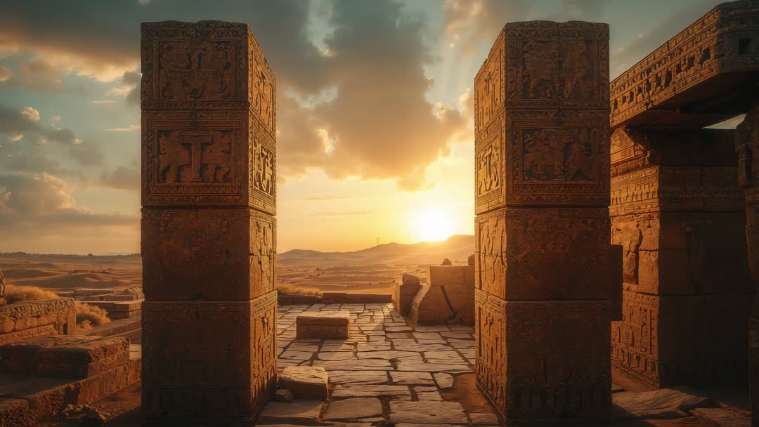 AI Generated Image. Video showing sunlight bathing ancient temple courtyard while sun descending behind dunes, carved pillars casting long shadows across cracked paved floor. Camera framing entrance between ornate columns, panning outward revealing sweeping desert landscape and dramatic sky. Suitable for travel brochure, history documentary opener, website hero banner, presentation background, book cover, museum signage, game concept art, cinematic establishing shot. Suggestions including color grading toward warm golden tones, slow tilt or slider moves for loopable clip, ambient wind sound and distant horn for atmosphere, overlay text placement on upper sky or lower paved area.