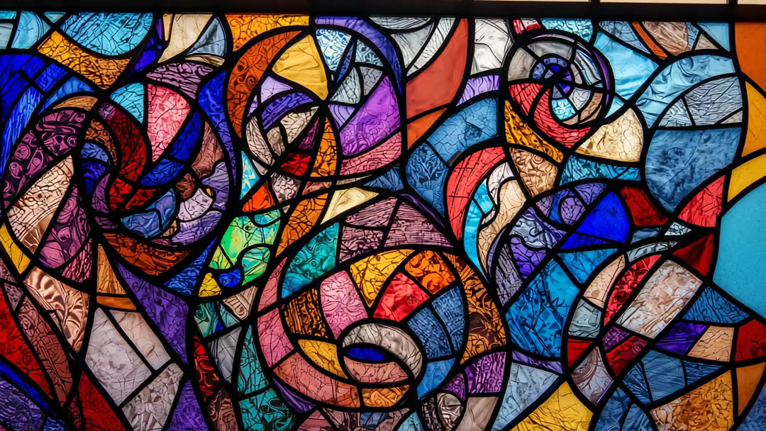 AI Generated Image. Sunlight filters through the stained glass pieces, casting vibrantly colored patterns. Rich geometric shapes combine with varied lead lines to create a mesmerizing illumination play. Ideal for visuals needing strong color themes, inspirations for artistic or spiritual content, or demonstration of stained glass artistry.