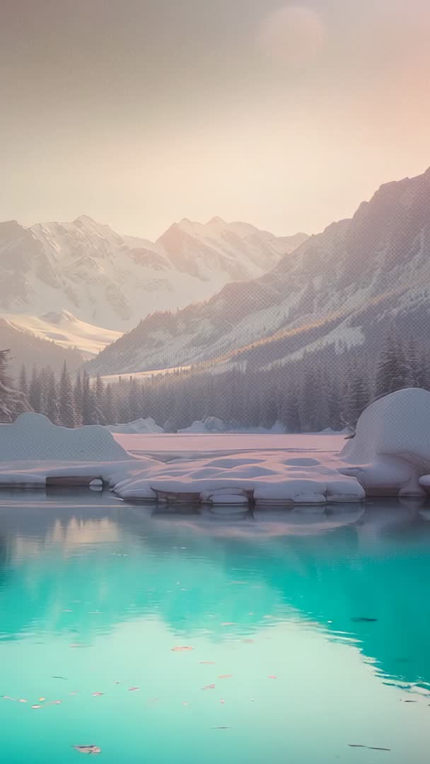 AI Generated Image. Footage showing sunlight intensifying over turquoise alpine lake, reflecting snow-covered peaks and dense pine forest during golden hour. Composition featuring frozen dock, layered ice shelves, and misty mountain silhouettes creating cinematic, tranquil mood. Ideal for vertical storytelling on mobile platforms, serving as background for social media reels, Instagram stories, TikTok, YouTube Shorts, and app splash screens. Useful for travel and tourism promotion, wellness and meditation videos, environmental and nature documentaries, hotel or lodge marketing. Visual elements offering pastel color palette, high contrast between warm sunlight and cool turquoise water, and smooth reflective motion for seamless looping.