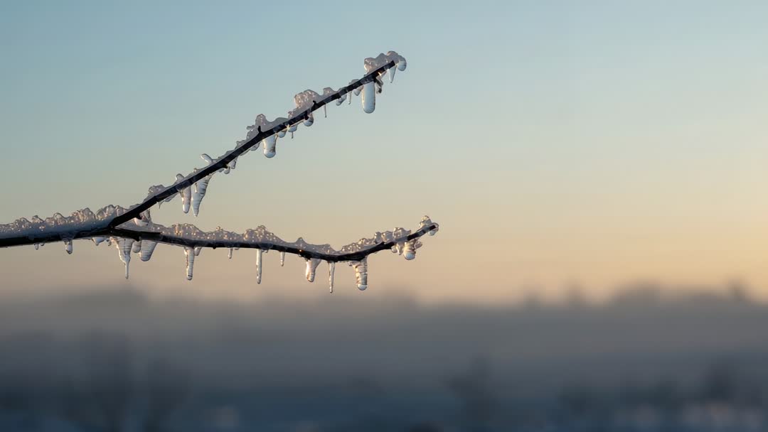 - Sunlight melting icicles on bare branch at sunrise, slow dripping and sparkling close-up