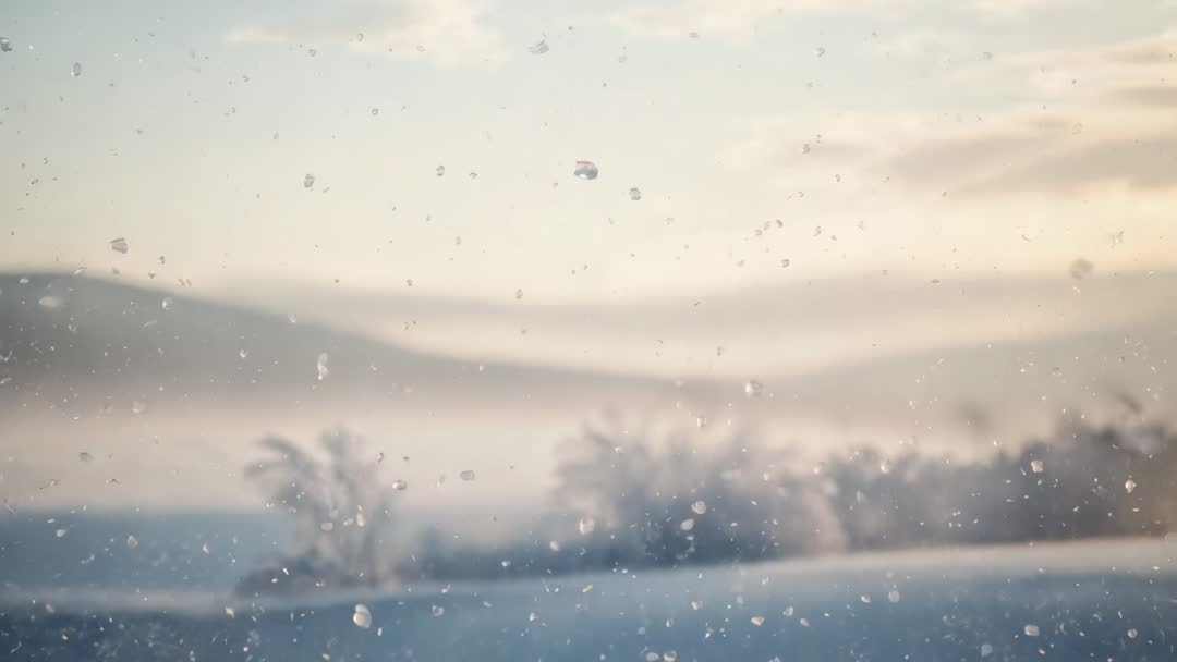 - Sunlight melting snow on window glass, droplets sliding over misty hills (slow motion)