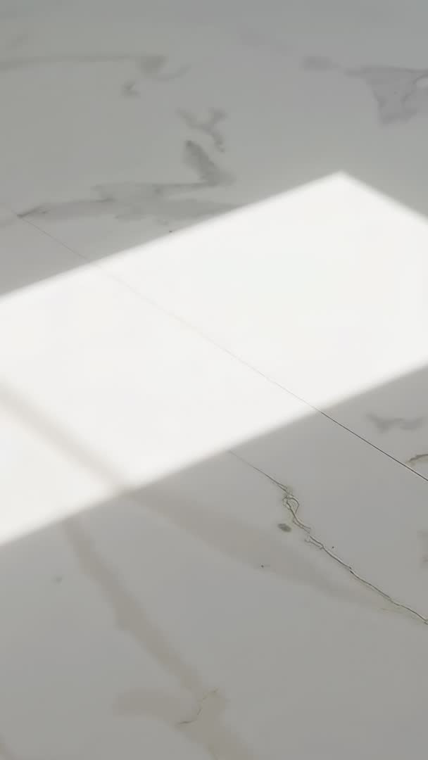 AI Generated Video. Showcasing sunlight sliding across polished marble tile floor, window grid shadow moving with sun and scuff mark tracing along grout line. Vertical clip capturing slow motion interplay of light and shadow, emphasizing marble veining and smooth surface texture. Serving well for interior design promos, architecture reels, real estate walkthroughs, product display backgrounds, mood setting in social media stories, and transitions in lifestyle videos. Offering vertical orientation, soft natural light, minimal motion, and loop-friendly composition; crop for mobile stories or full-screen hero sections.