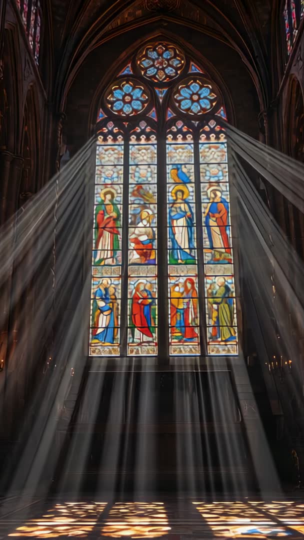 AI Generated Image. Vertical video showing sunlight pouring through Gothic stained glass lancet, casting vibrant colored beams and swirling dust motes across vaulted nave. Backlit columns and ornate tracery are creating dramatic shafts of light and patterned reflections on stone floor, producing serene and reverent atmosphere. Clip featuring slow-moving light, high contrast and rich color saturation, presenting strong visual focal point for vertical screens. Ideal for using in worship service promotions, historical documentary b-roll, travel and culture reels, architecture showcase, meditation or spiritual content, social media vertical ads and title sequences. Suggested edits include pairing with ambient organ or choir audio, adding gentle slow zoom or parallax, color grading for warmer tones, and looping for background visuals in live events or presentations.